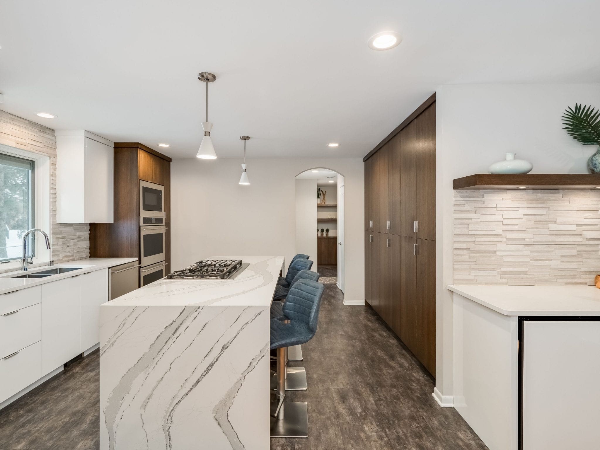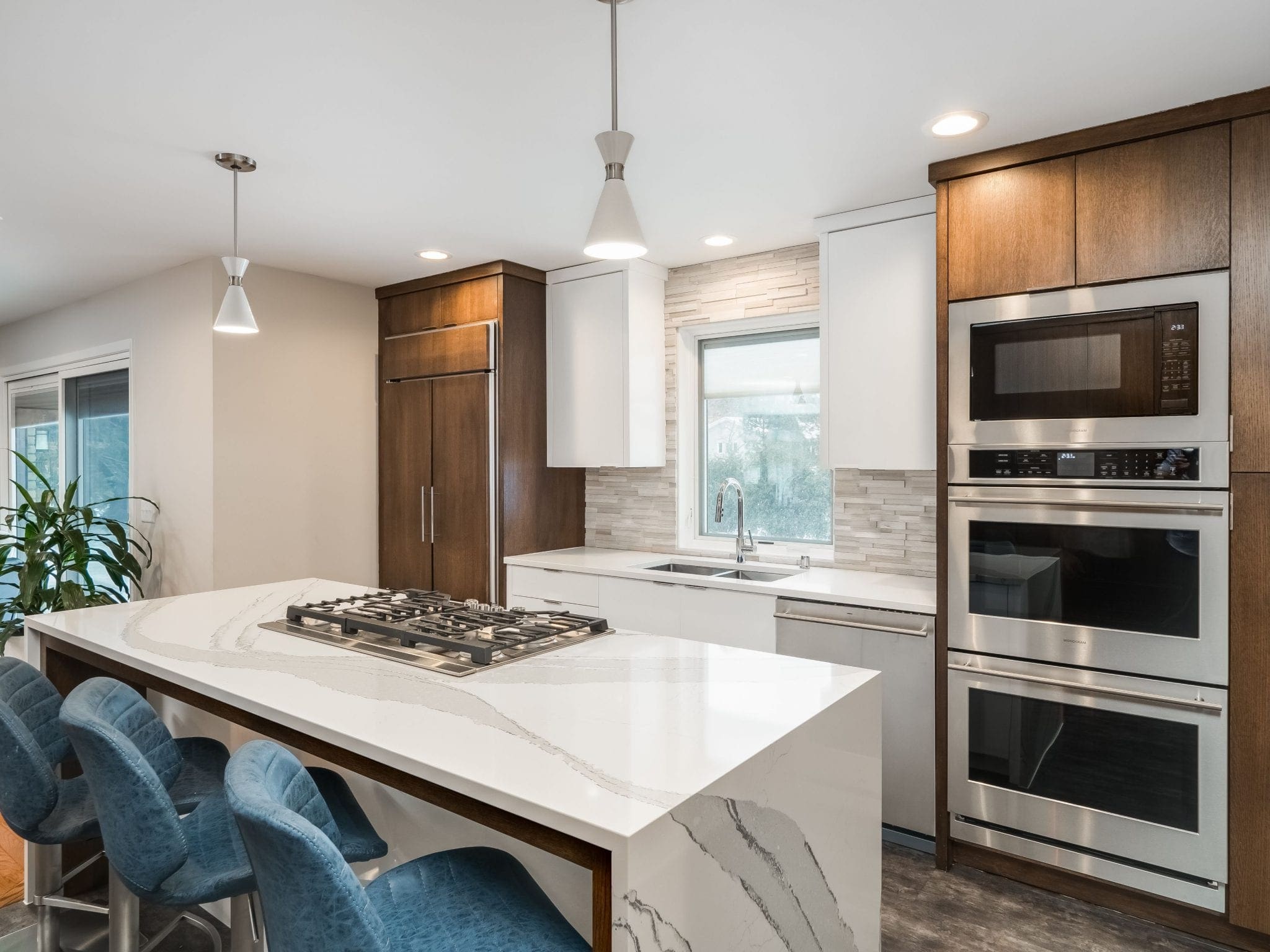 On the interior, we ensure a natural flow by aligning floor transitions, maintaining consistent trim and millwork, and using complementary materials to create a cohesive home aesthetic.